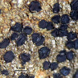incolore ou brunâtre. Spores très nombreuses (100), 3-5 x 1-1,5 µm. Réactions chimiques négatives. Dans les fissures de roches siliceuses, murs en granite... En situation généralement bien éclairée. |