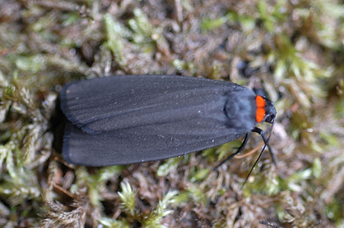 Espèce des milieux forestiers, facile à reconnaître avec sa couleur noire et son collier rouge, d'où son nom ; vole jour et nuit, de mai à juillet, en une seule génération ; les chenilles se nourrissent de lichens.